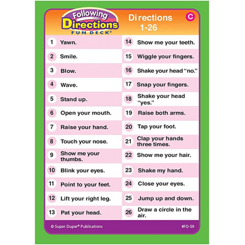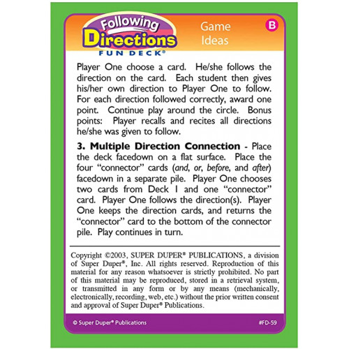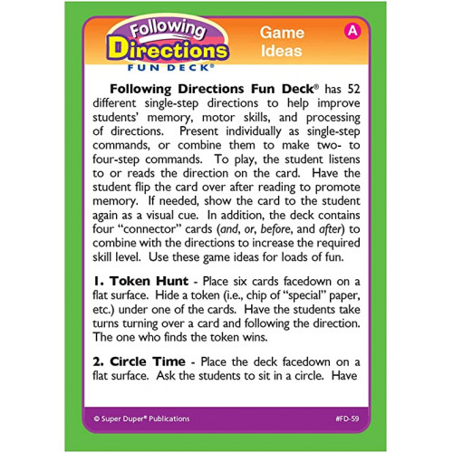 This Following Directions Fun Deck focuses on improving students' memory, motor skills, and processing of directions. Use the cards individually to present single step directions or combine them for multiple directions. The deck includes 52 different single step directions, four "connector" cards (and, or, before, and after), content cards, and game idea cards.Â