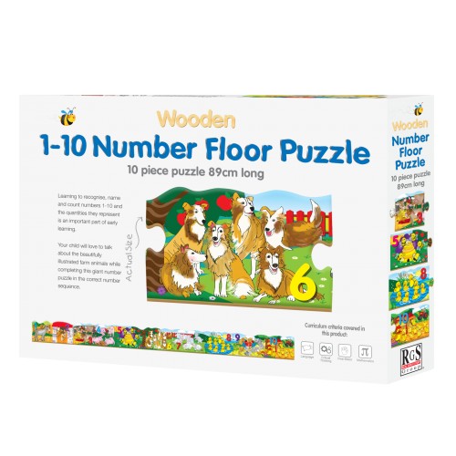Numbers large wooden floor puzzle is the perfect introduction to numbers (1 to 10). These puzzles are perfect for use at home and pre-schools. While building this large 10-piece self-correcting wooden floor puzzle, children learn to recognise and name animals, numbers 1 to 10, the quantities the numbers represent as well as sequencing by building the puzzle in the correct number order.